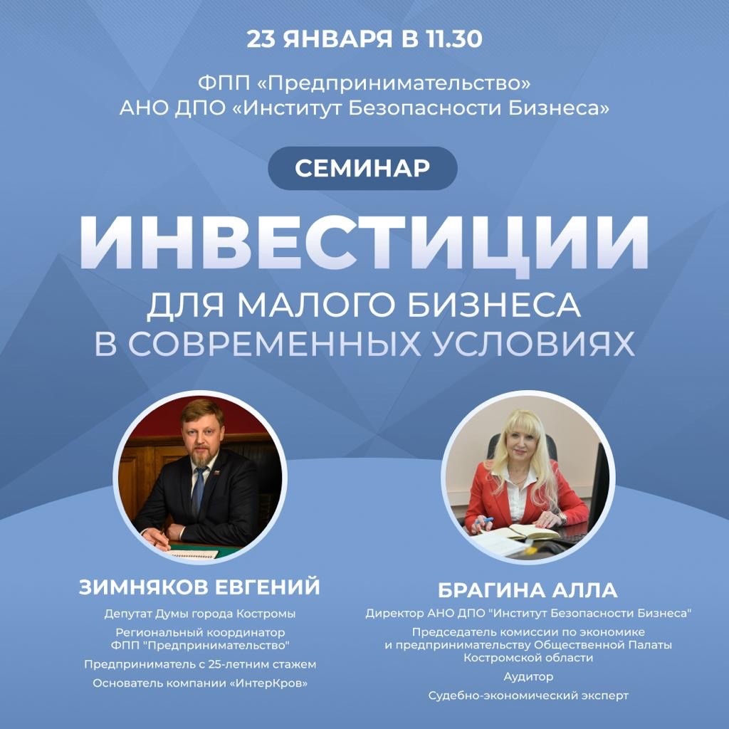 Где найти инвестора на проект? Какие существуют способы привлечения инвестиций для стартапа? На какой вид деятельности предприниматель может получить грант до 3 миллионов? Можно ли получить субсидию на открытие бизнеса? На эти и другие вопросы ответим 23 января в 11ч.30 мин на семинаре, который состоится в Штабе общественной поддержки Костромской области по адресу: г. Кострома, ряды Зеленые (рядом с магазином «Дом книги»).